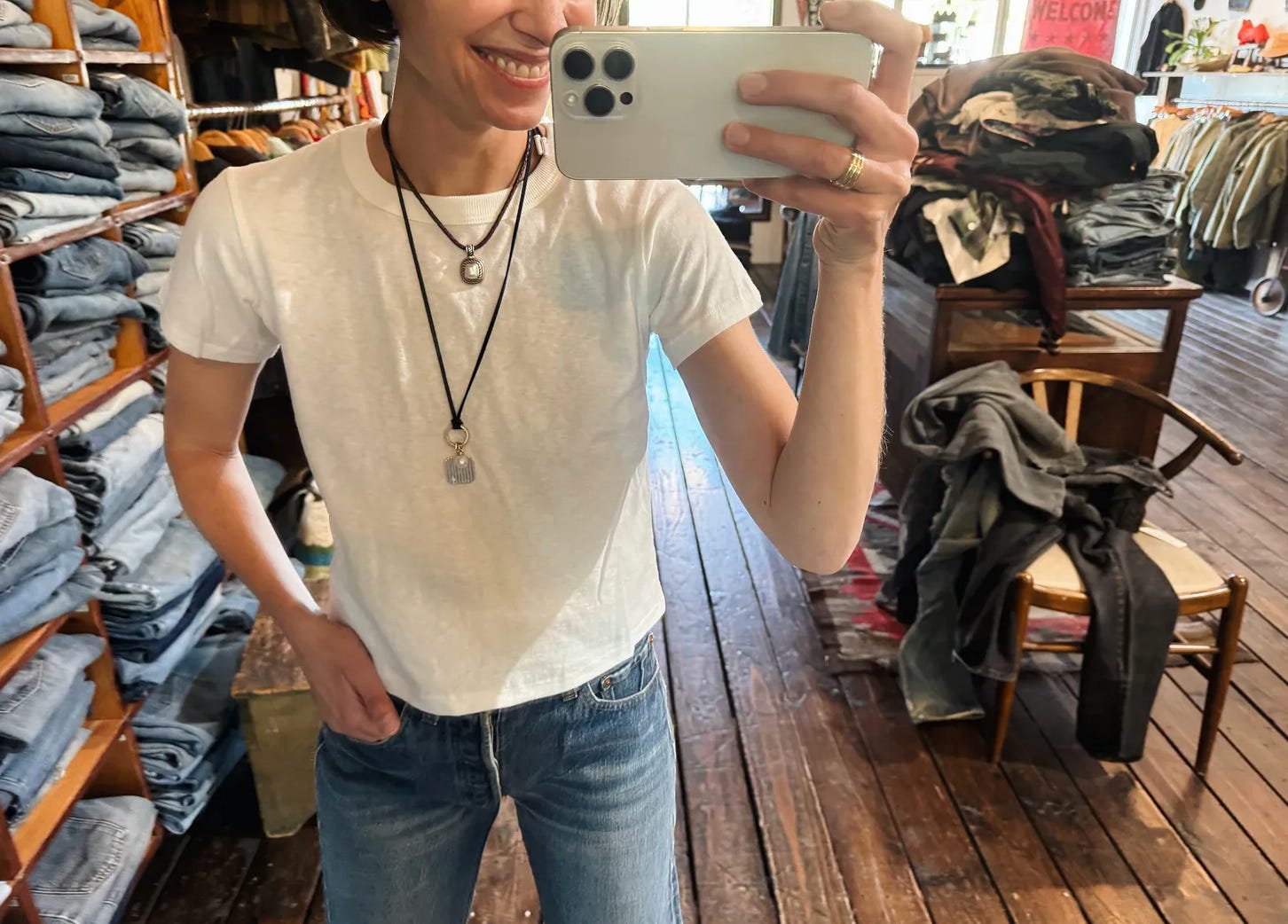 I personally like 100% cotton tees with a drier hand feel. Nothing too silky to the touch, or made with modal. My favorite is this one from Made Revival because it was designed by a vintage expert to pair perfectly with a Levi’s 501. I have one for every day of the week!