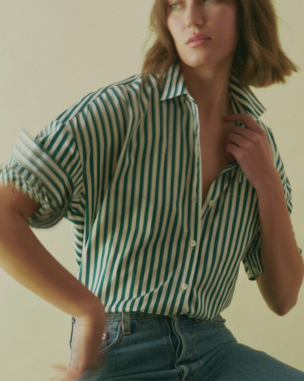 Now based in Charleston, Erin founded a home goods shop when she first moved, then found her way back to fashion, working with designer Alabama Chanin. During the pandemic, she started draping her own shirt designs while her newborn napped. She launched E.M. Reitz in 2022, focusing on menswear-inspired shirts for women. The line has since expanded to include men’s shirts, and her husband Brooks Reitz has joined the business.