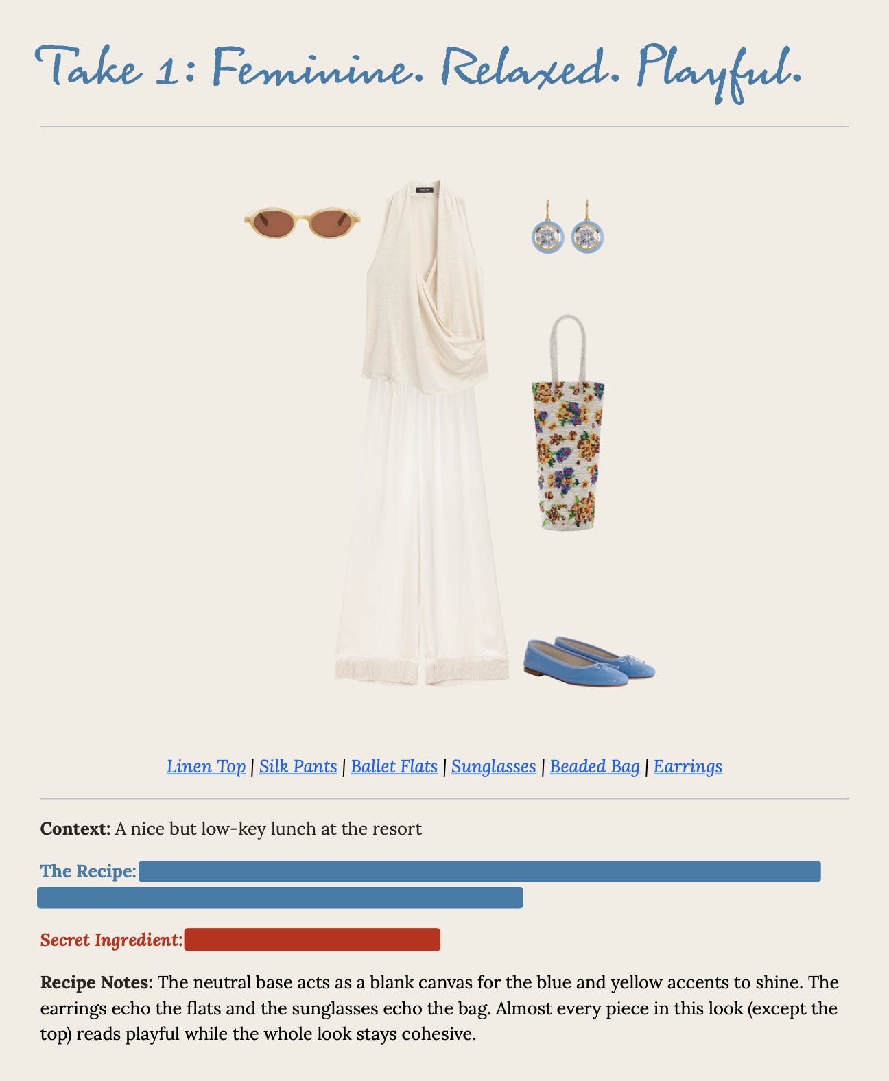 Your style words describe the feeling (what) or identity (who). Your Style Recipe is how you translate and execute those words in your actual life. They don’t need equal airtime in every look. They tend to dial up or down depending on the day, which is exactly how style actually works, and exactly what the Recipe handles.