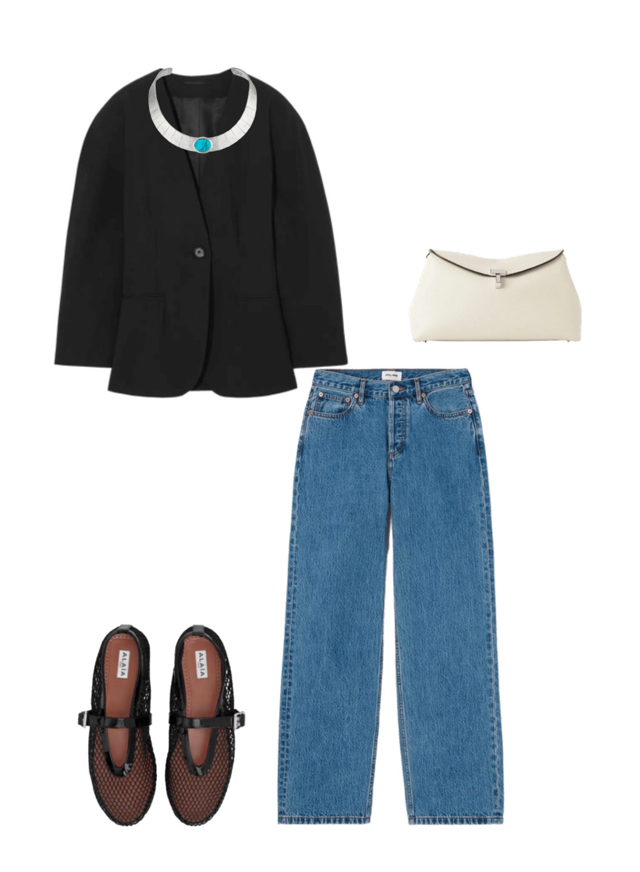 Jeans // Mesh flats // Clutch // Similar blazer // Necklace