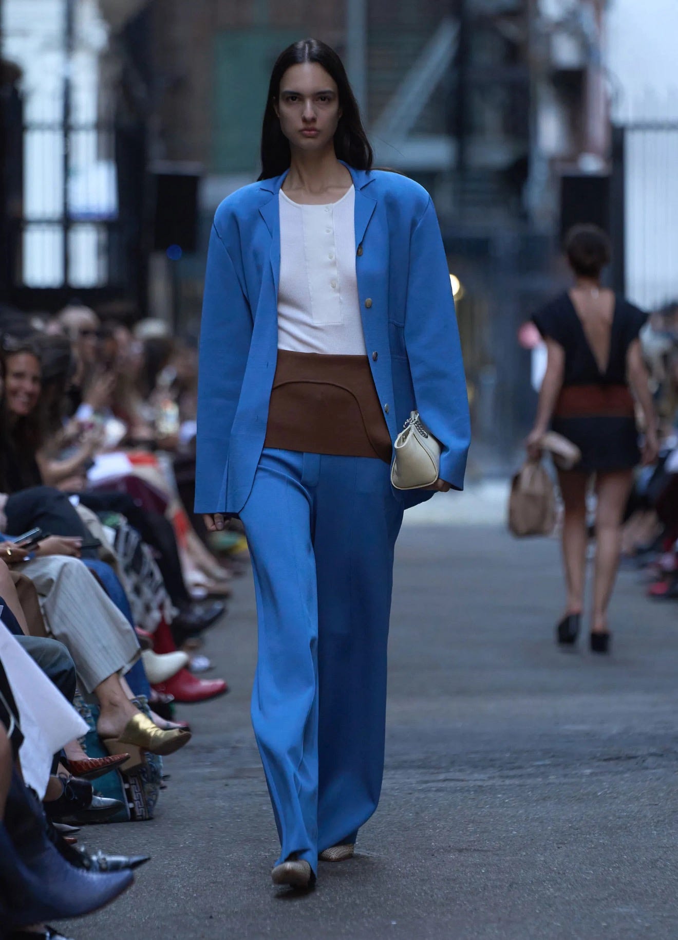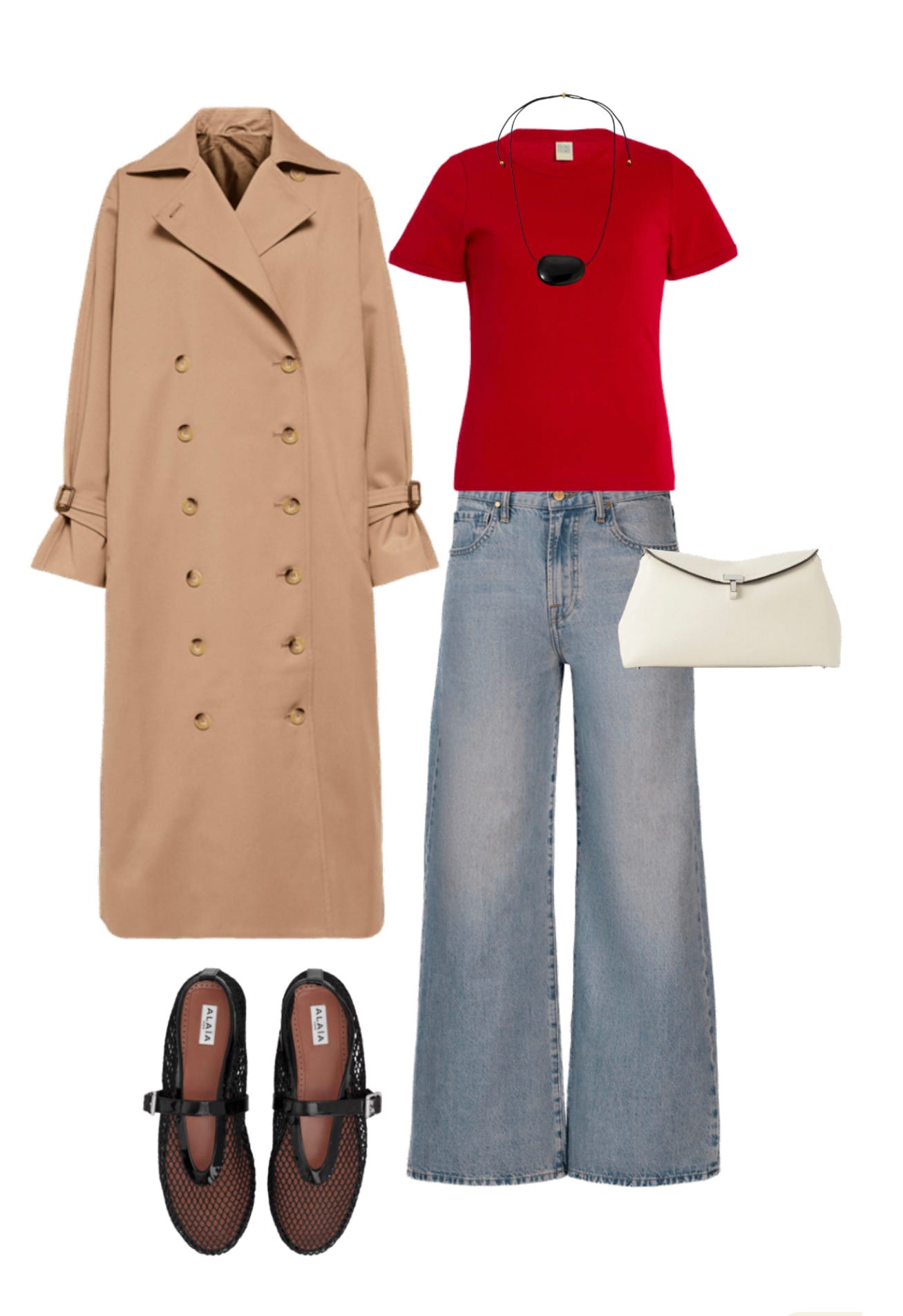That pop of red against khaki and denim instantly makes everything more interesting. There’s something unexpectedly edgy about mesh flats peeking out from wide-leg jeans that feels both playful and intentional.