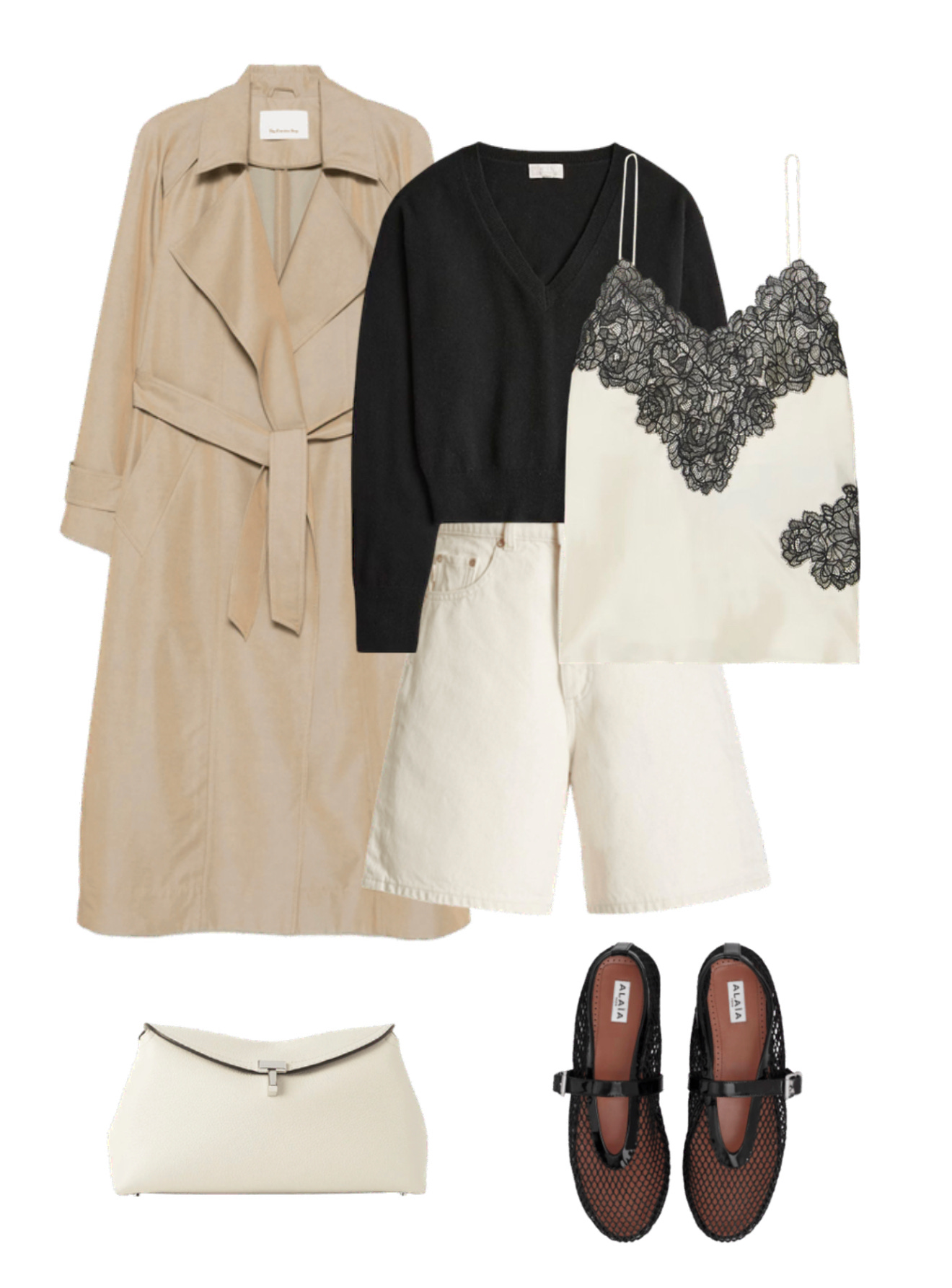 Mesh flats are the perfect transitional shoe — they give you more coverage than a sandal while keeping things airy for those in-between weather days. I’m obsessed with this bermuda short and trench coat pairing as a transitional look. The proportions just work. Drape a knit over your shoulders for that effortless layered vibe, or wear it over the lace cami when you need a bit more warmth.