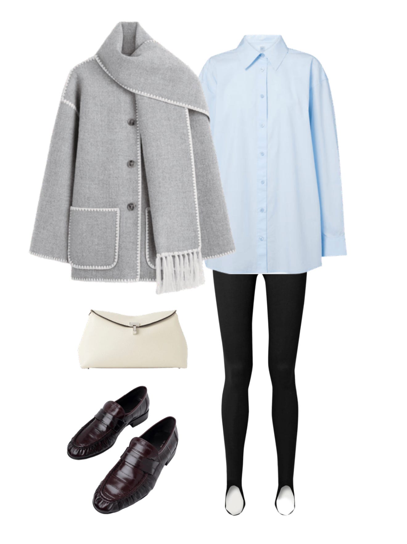 Yes, you absolutely can wear leggings out and still feel polished. The secret is in the proportions — I love pairing stirrup leggings with an oversized button-up (length is everything here!) and a classic loafer. It’s chic and comfy without trying too hard. The scarf jacket adds that extra layer of sophistication that makes the whole look feel intentional rather than just thrown together.