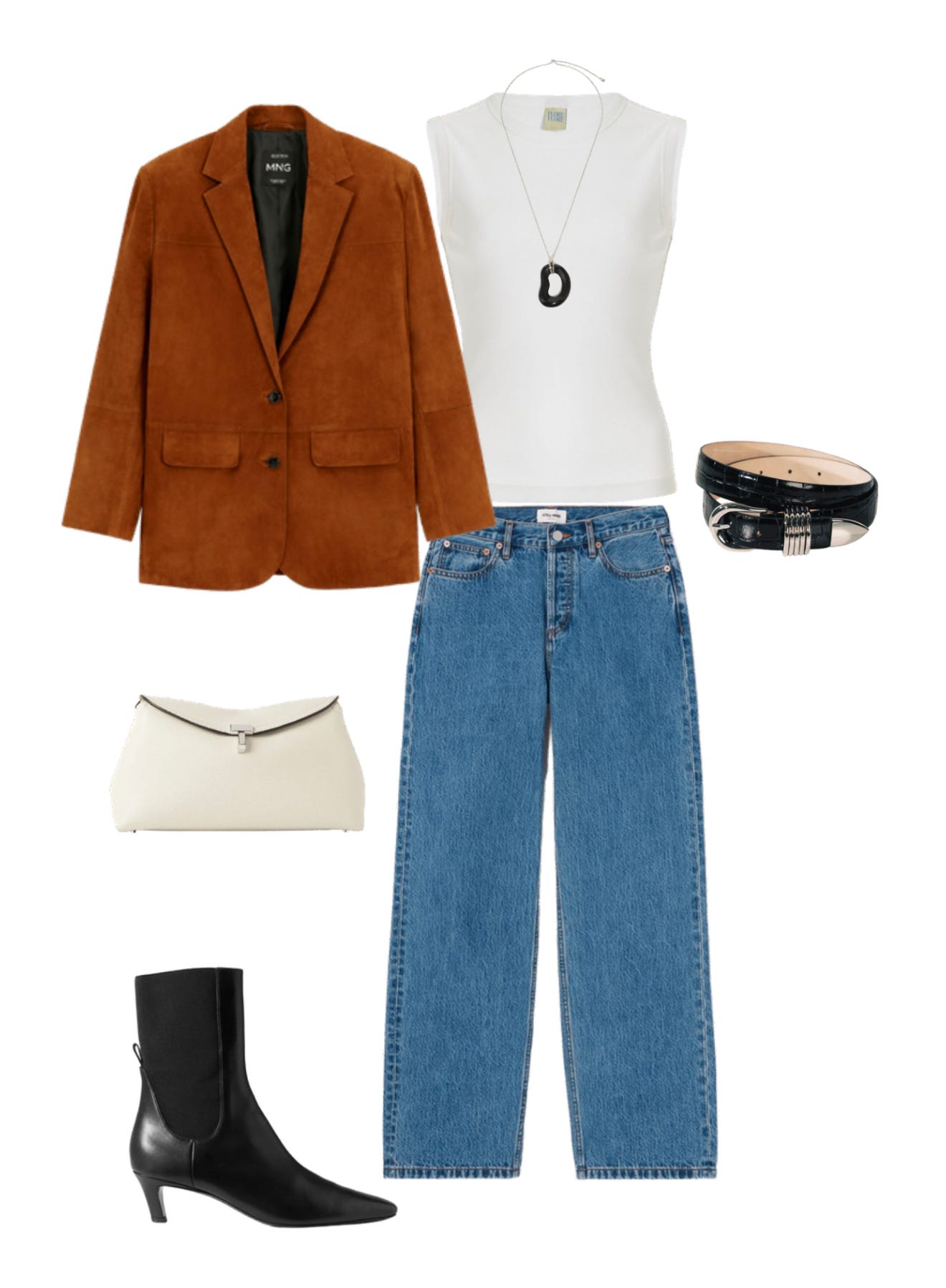 The slim shaft means versatility across different cuts — straight, barrel or wide-leg jeans. When wearing a cropped style, the key is getting the hem of your jean to hit right at the opening of the boot for the best proportions. I love adding a suede blazer over a simple tee or tank with a relaxed classic blue wash creates a nice contrast, and the neutrals all work together.