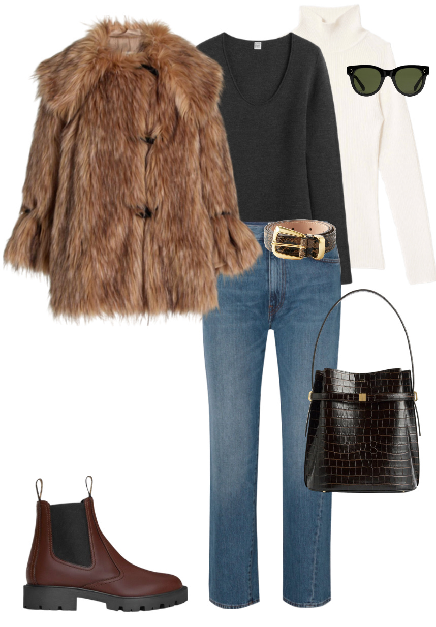 I always keep in mind how a client wants to feel in these outfits while creating looks. This particular client wants to feel chic, cool, and confident (her own words) even on the weekends, and I thought a luxe and playful faux fur jacket would instantly get her there. Her aesthetic also leans on the elegant side — accessories like a textured belt and leather tote keep the outfit refined.