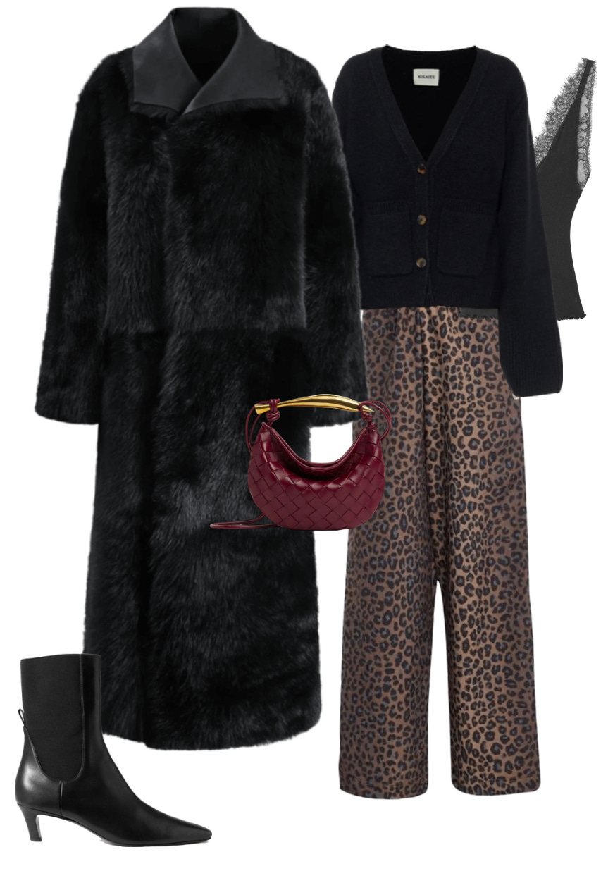 The client asked for an outfit to wear to dinner at a restaurant, but didn’t specify a dress code. Knowing that her style leans dressy and elegant, I wanted to create a look around her Nour Hammour shearling number. Because the coat is the outfit. She also had a new pair of leopard trousers that hadn’t been styled yet, which immediately caught my eye.