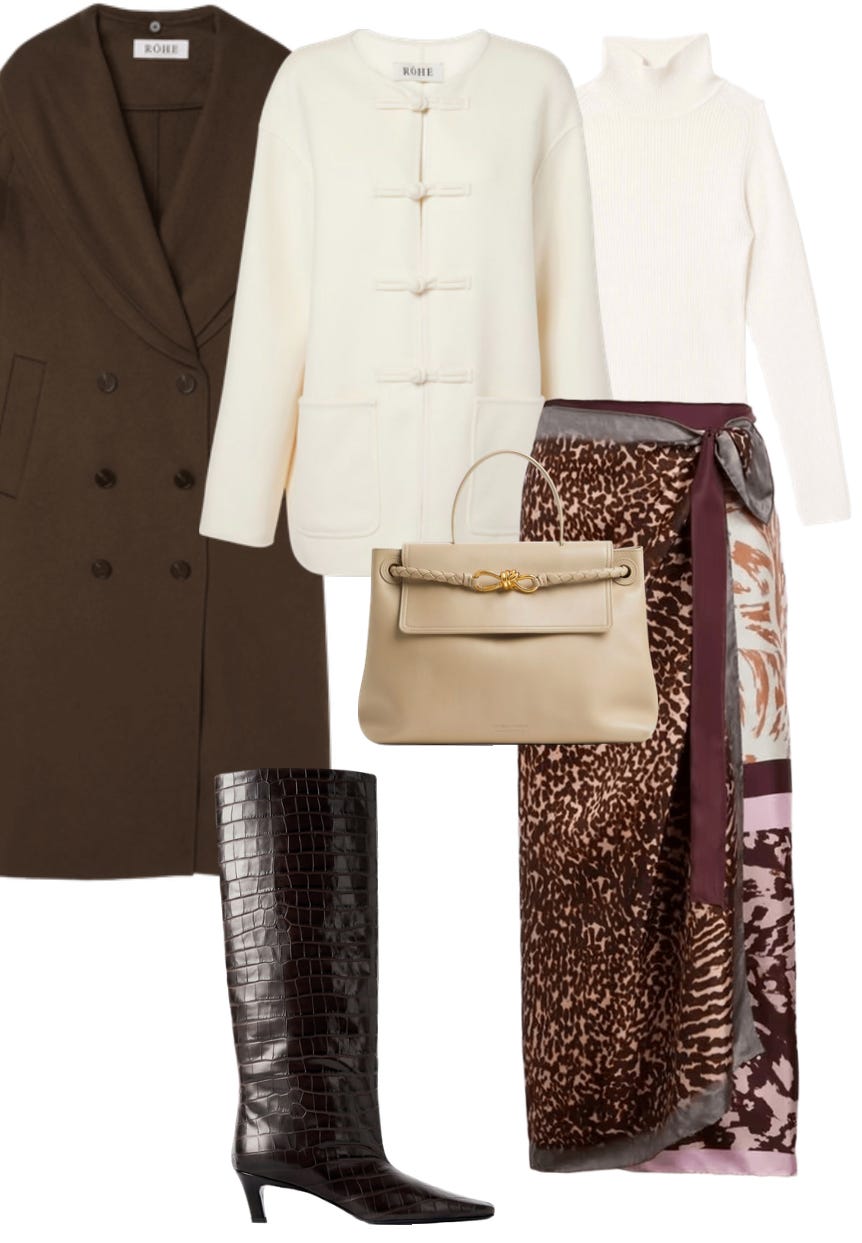 I also noticed my client’s go-to outfit for the office: a luxe sweater paired with a maxi slip skirt and low-heeled boots. I wanted to recreate this combo with a fresh spin that will keep her polished and warm at work. Instead of a solid slip skirt, I went for a printed Dries wrap skirt (with tights underneath), paired with a slim turtleneck, tucked in the skirt, and her stunning Rohe mandarin jacket layered like a blazer.